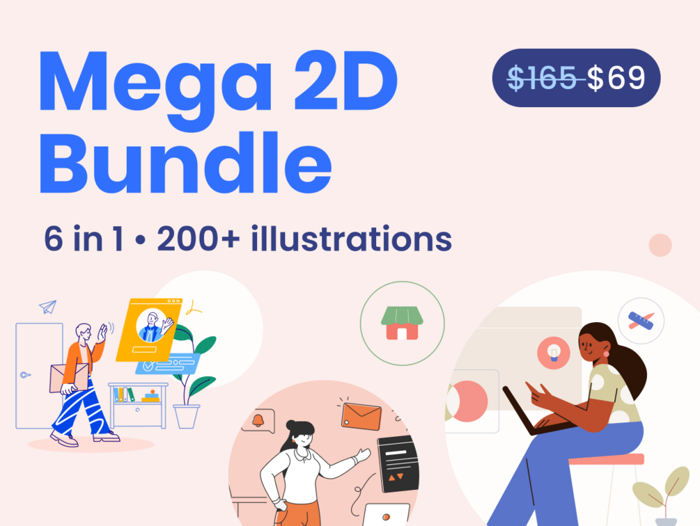 Limited time MEGA 2D Illustration bundle featuring people and technology with over 200+ assets.